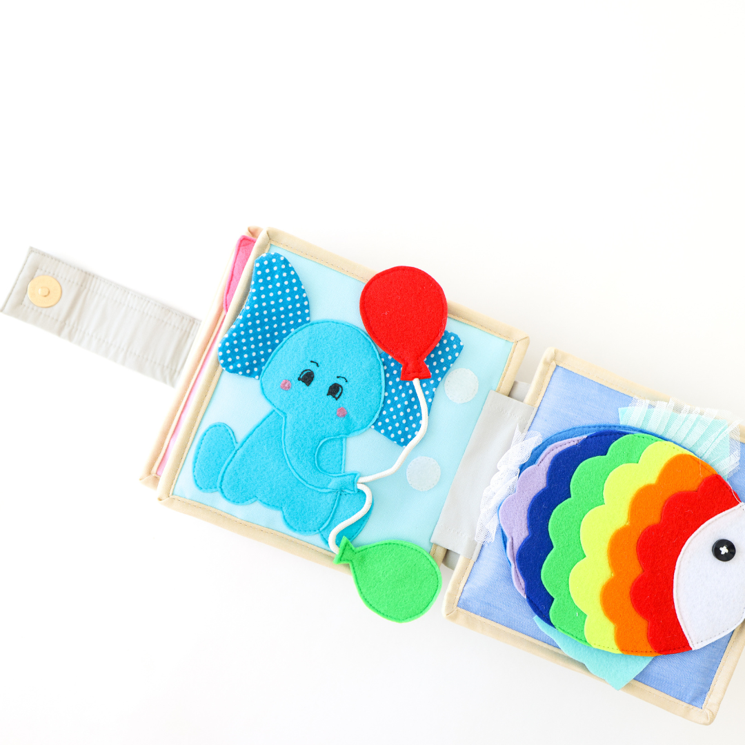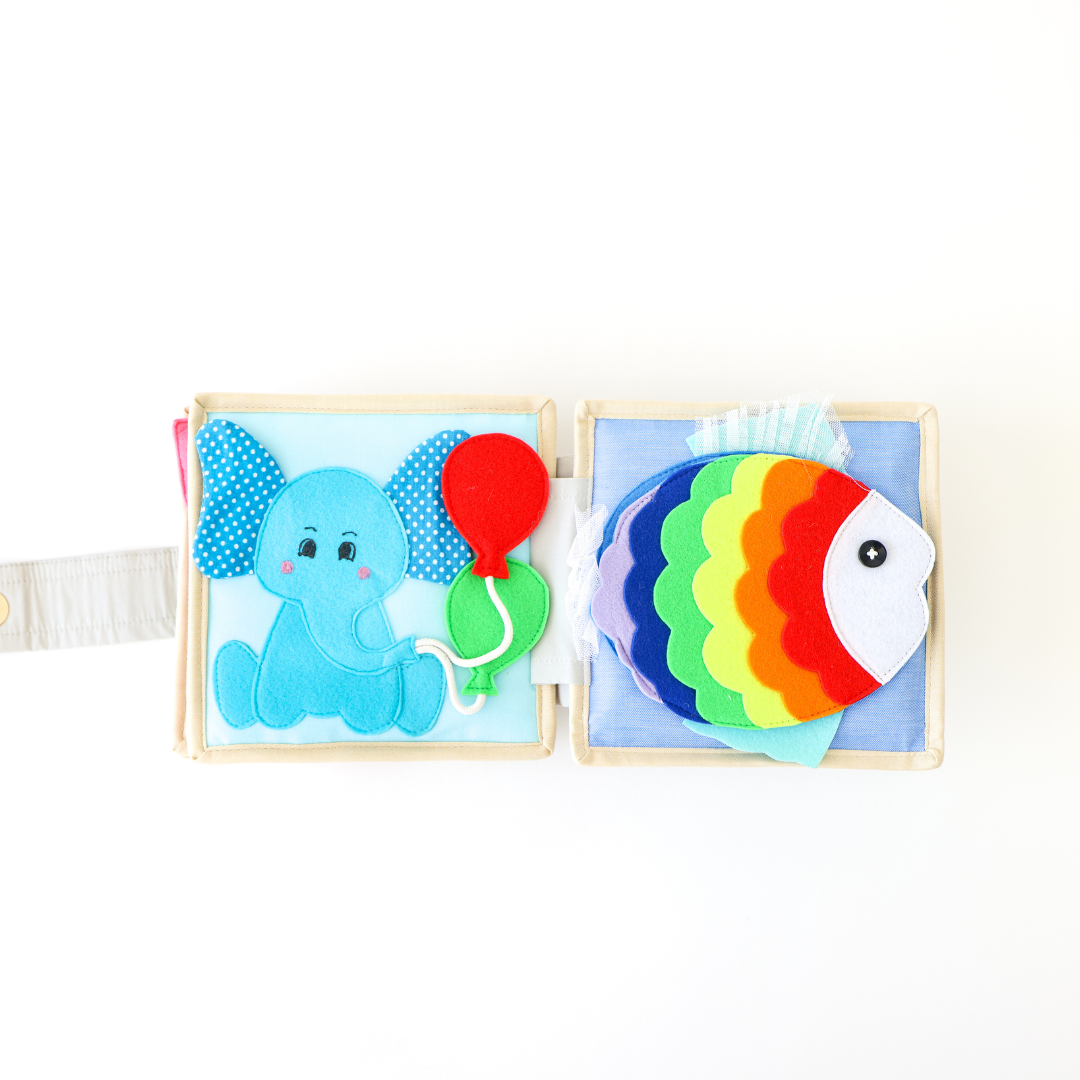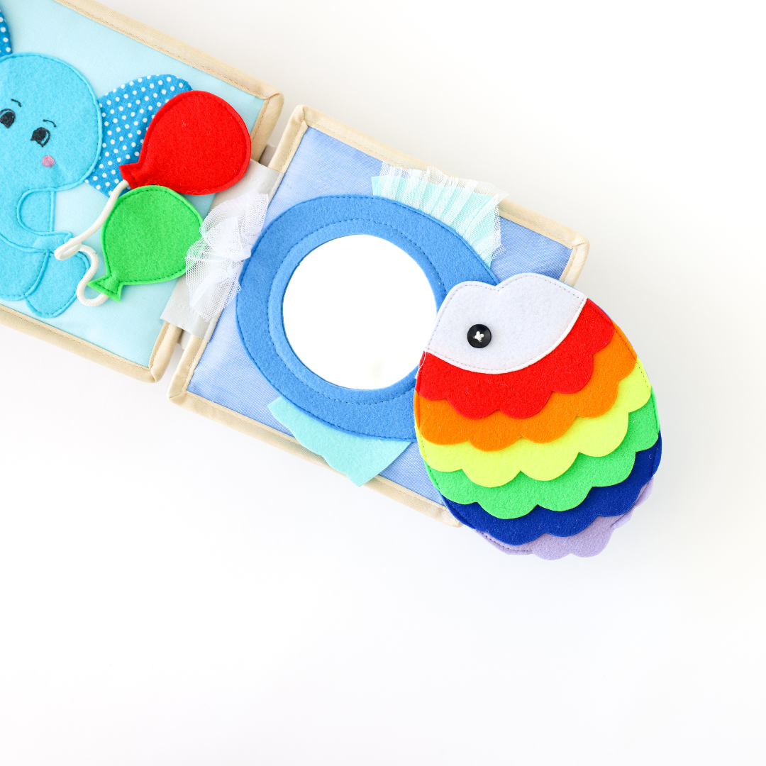 7. Rainbow Fish with Peekaboo Mirror: The final page of our Mouse Quiet Book features a delightful surprise - a rainbow fish with a peekaboo mirror! Perfect for tummy time fun, this free-standing mirror will captivate your baby, promoting self-discovery and visual stimulation.