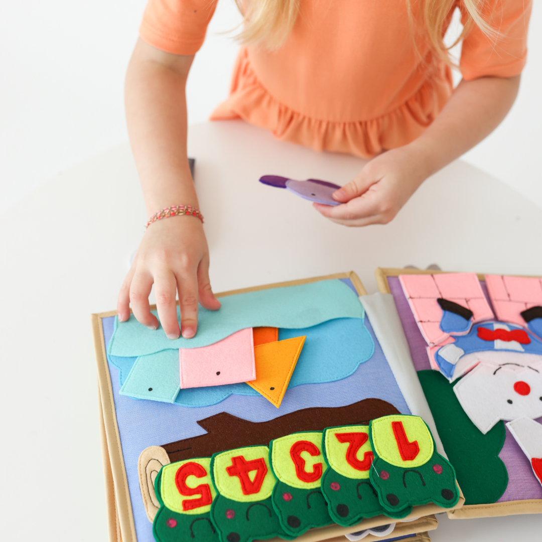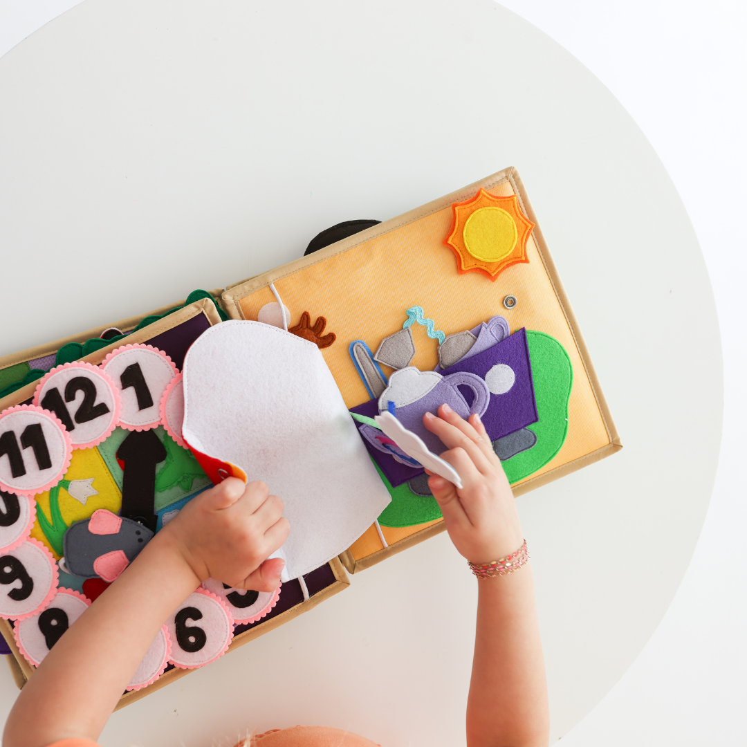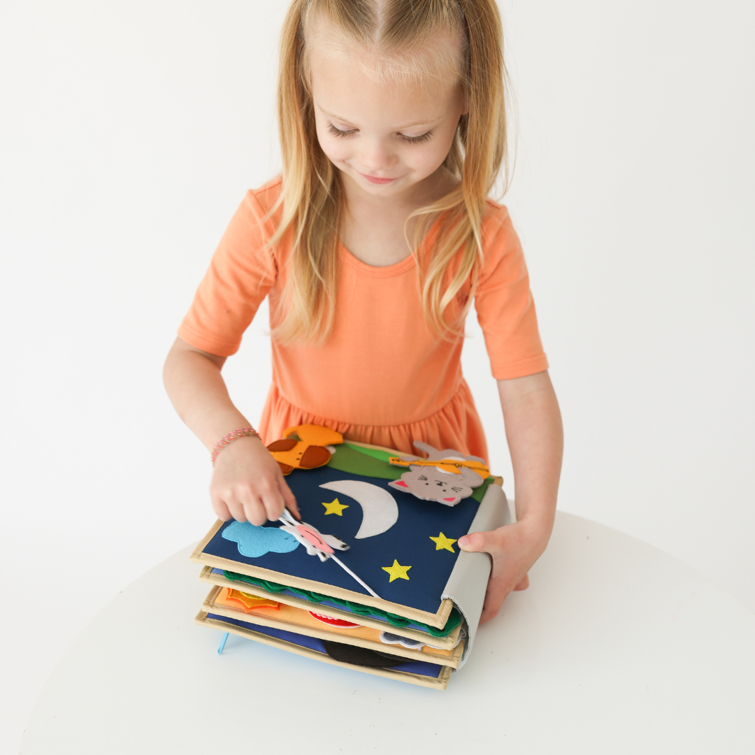 This quiet book is designed to strengthen your child's math skills, language comprehension, understanding of time, creative play, fine motor skills, memory, and much more!
