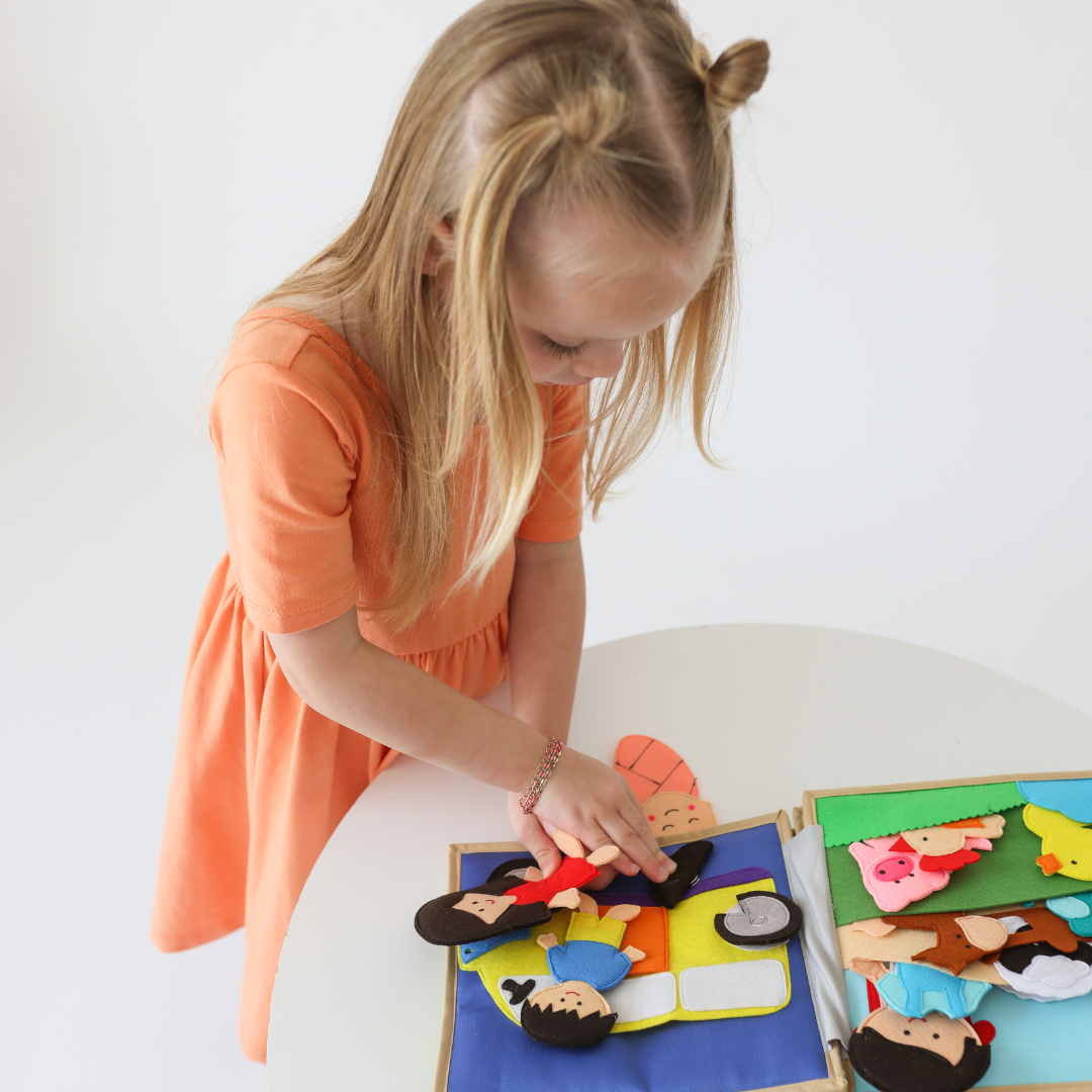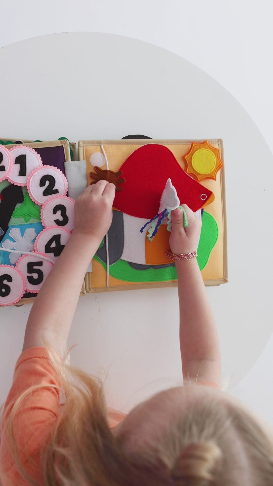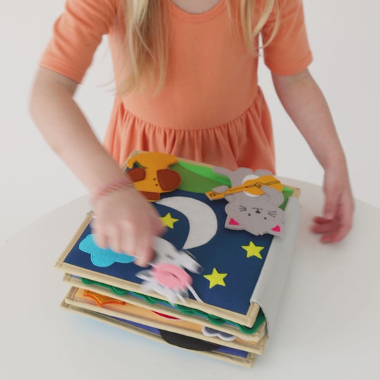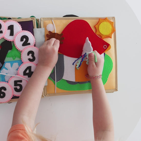 This quiet book is designed to strengthen your child's math skills, language comprehension, understanding of time, creative play, fine motor skills, memory, and much more!